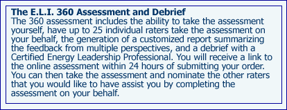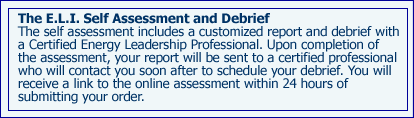 The E.L.I. is an attitudinal assessment, which is based on an energy/action model. This assessment differs from personality assessments as it is not intended to label a person and have them work well within that label. Instead, it measures your level of energy based on your attitude, or perception and perspective of your world. Because attitude is subjective, it can be altered. By working with a coach using the E.L.I., you can alter your attitude and perspective, make a shift in your consciousness, and increase your energy and leadership effectiveness.